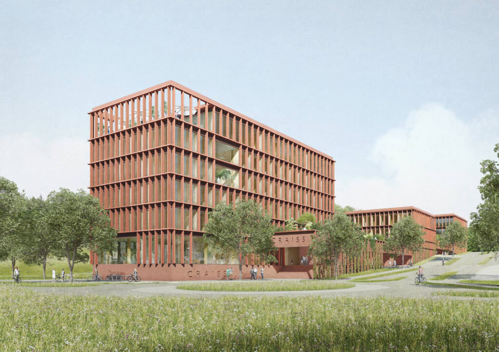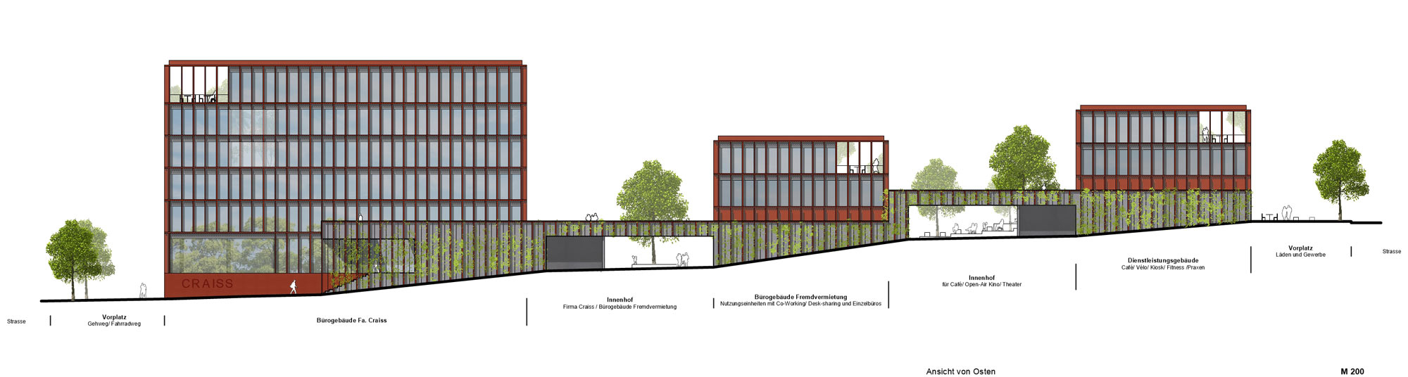 Den Auftakt des Ensembles bildet der Büroneubau der Firma Craiss. Die anderen beiden Baukörper für die externe Vermietung von Büroflächen und Dienstleistungsgewerbe sind jeweils durch Höfe rhythmisiert und nehmen in Ihrer Kubatur die Bebauung am Quartiersplatz auf.