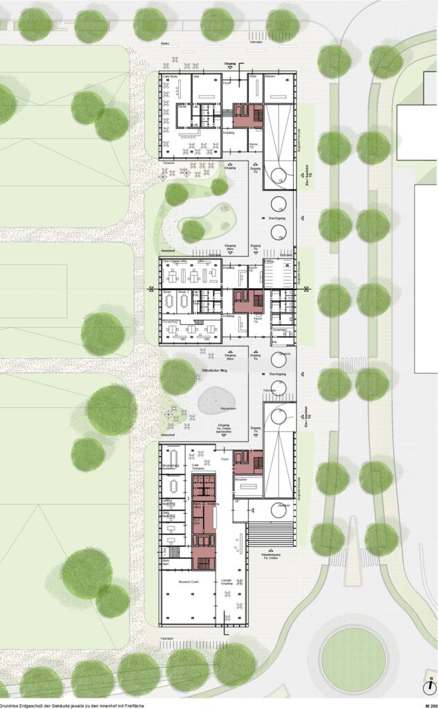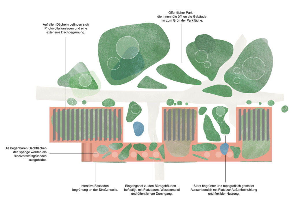 Verbindendes Element der drei Neubauten ist die in Richtung Osten, zur Straße vorgelagerte Einheit, die wie eine Spange die drei Baukörper fasst. Die straßenbegleitende Spange erzeugt die räumliche Fassung der Innenhöfe, gleichzeitig werden sämtliche Hauptzugänge und Erschließungen darüber abgebildet.