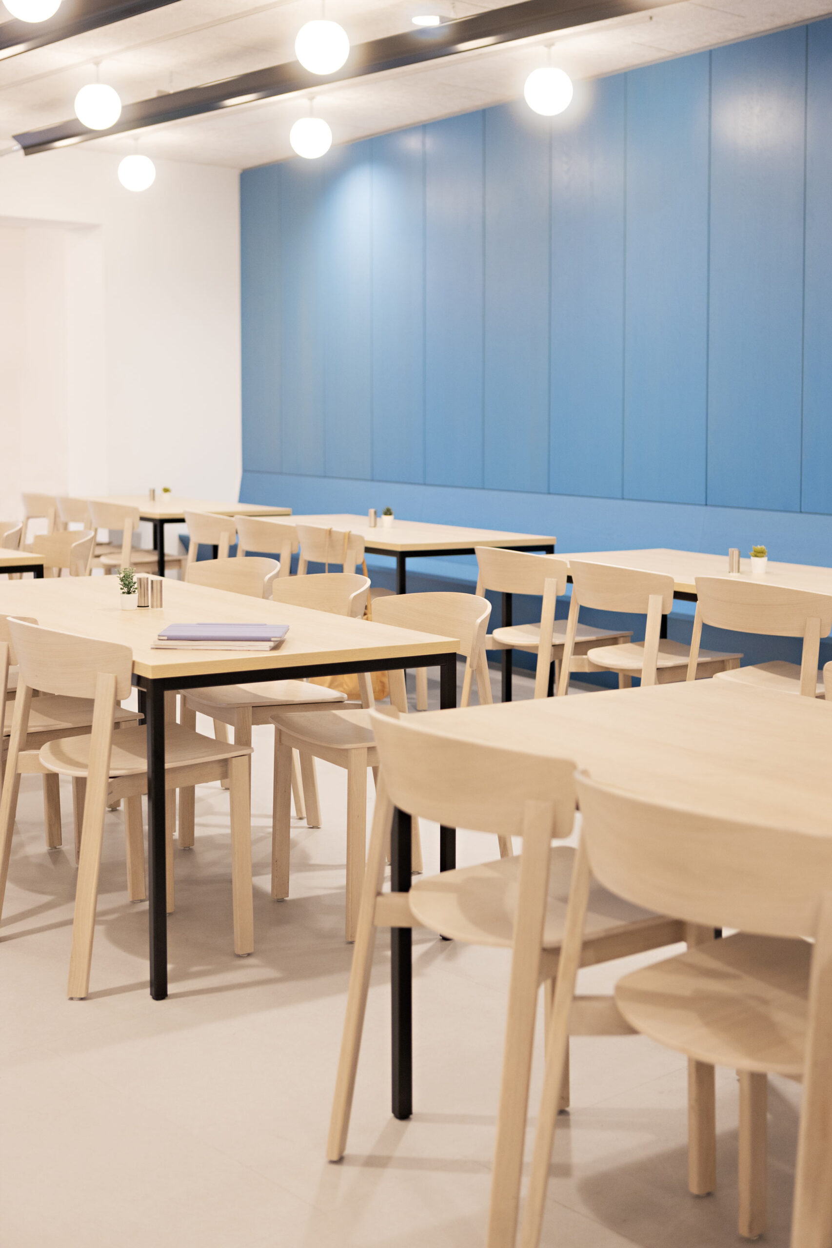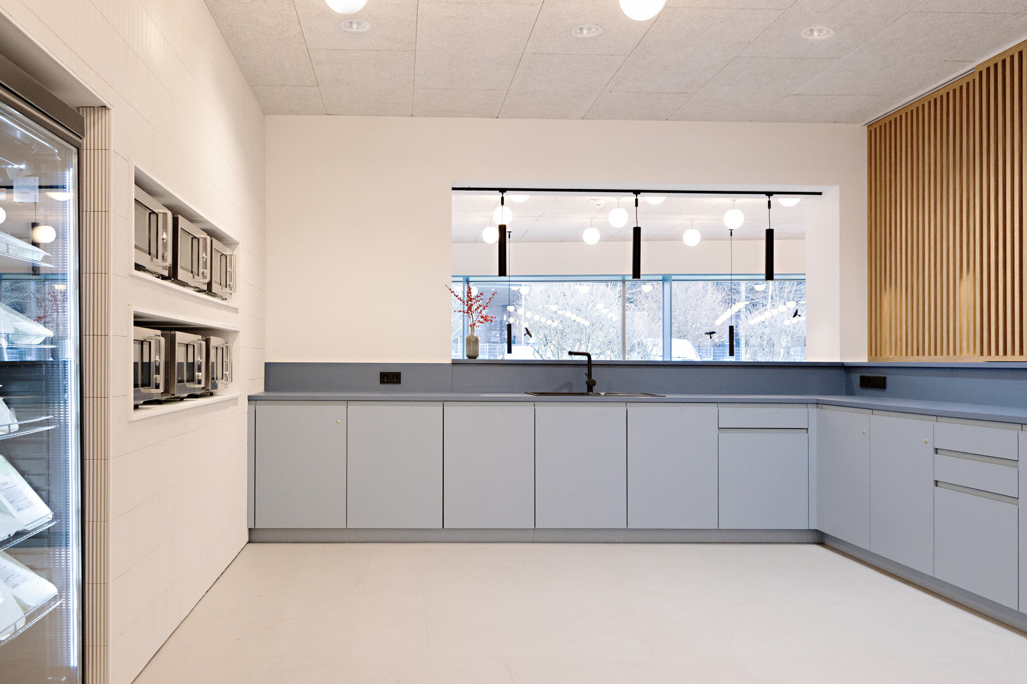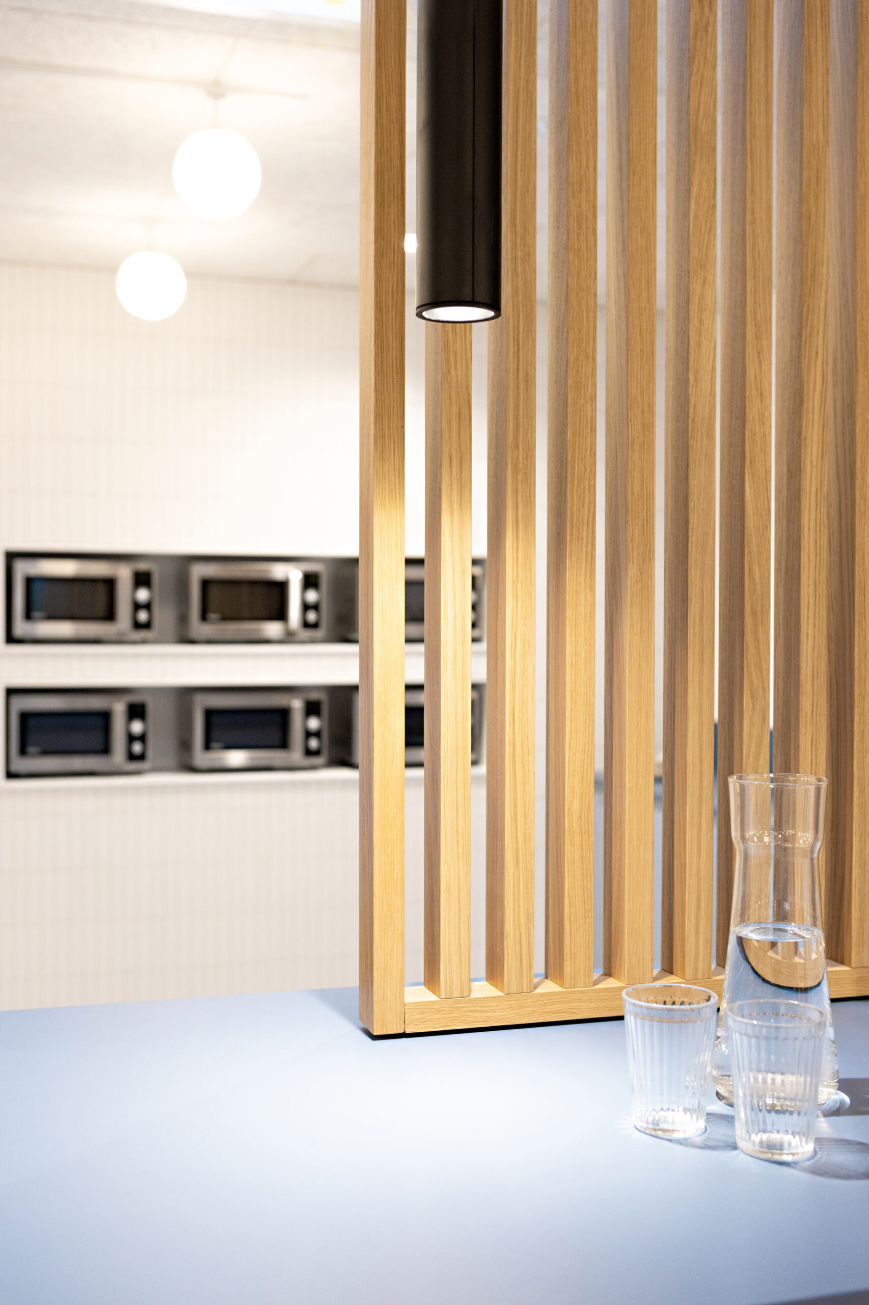 Aus dem fensterlosen Archiv wurde mit innovativen Ideen ein heller und zum Verweilen einladener Raum, den die Mitarbeitenden in ihren Pausen, bei Besprechungen oder Firmenfeiern flexibel nutzen können.