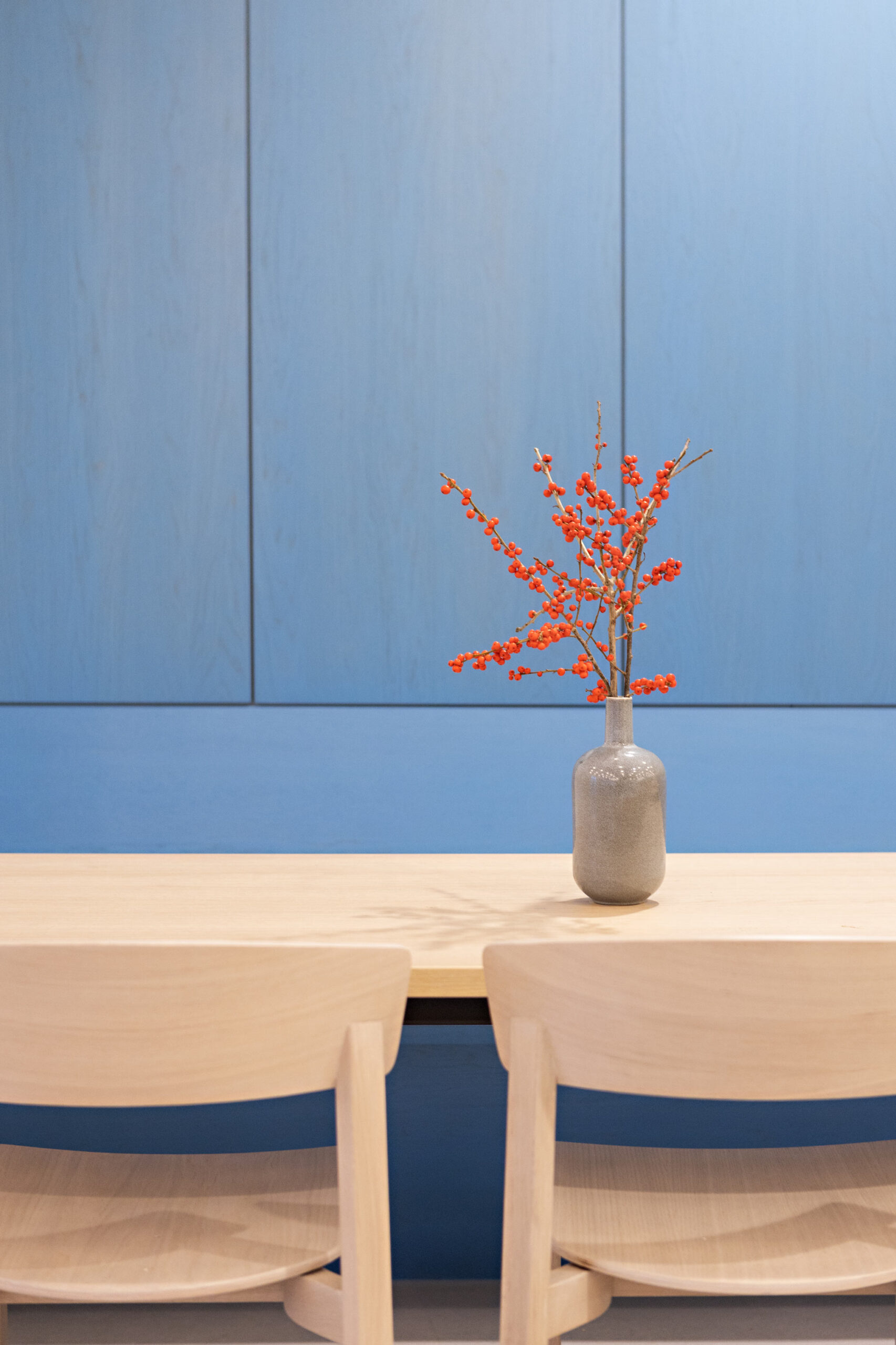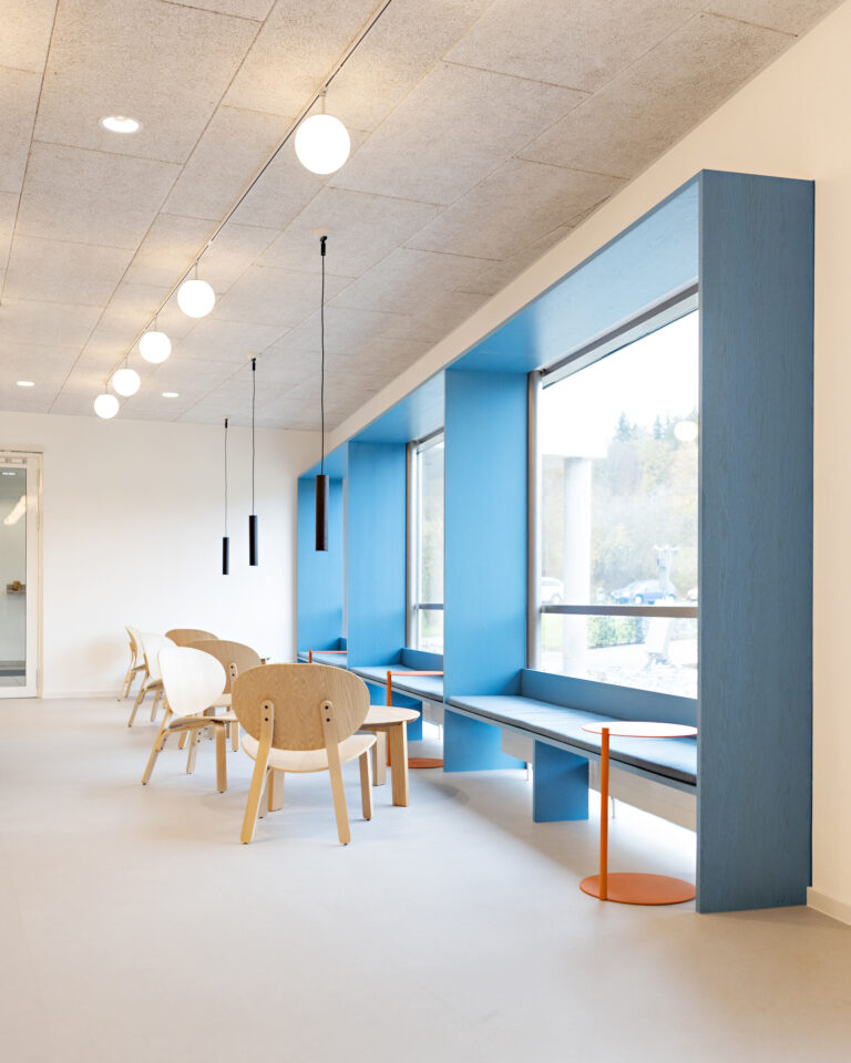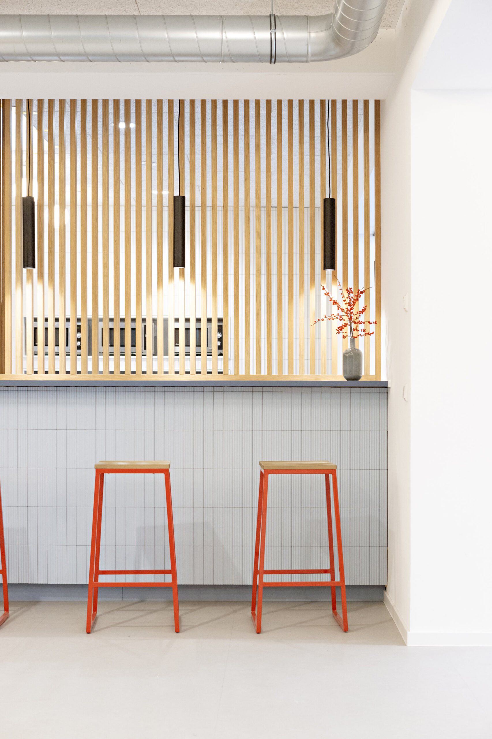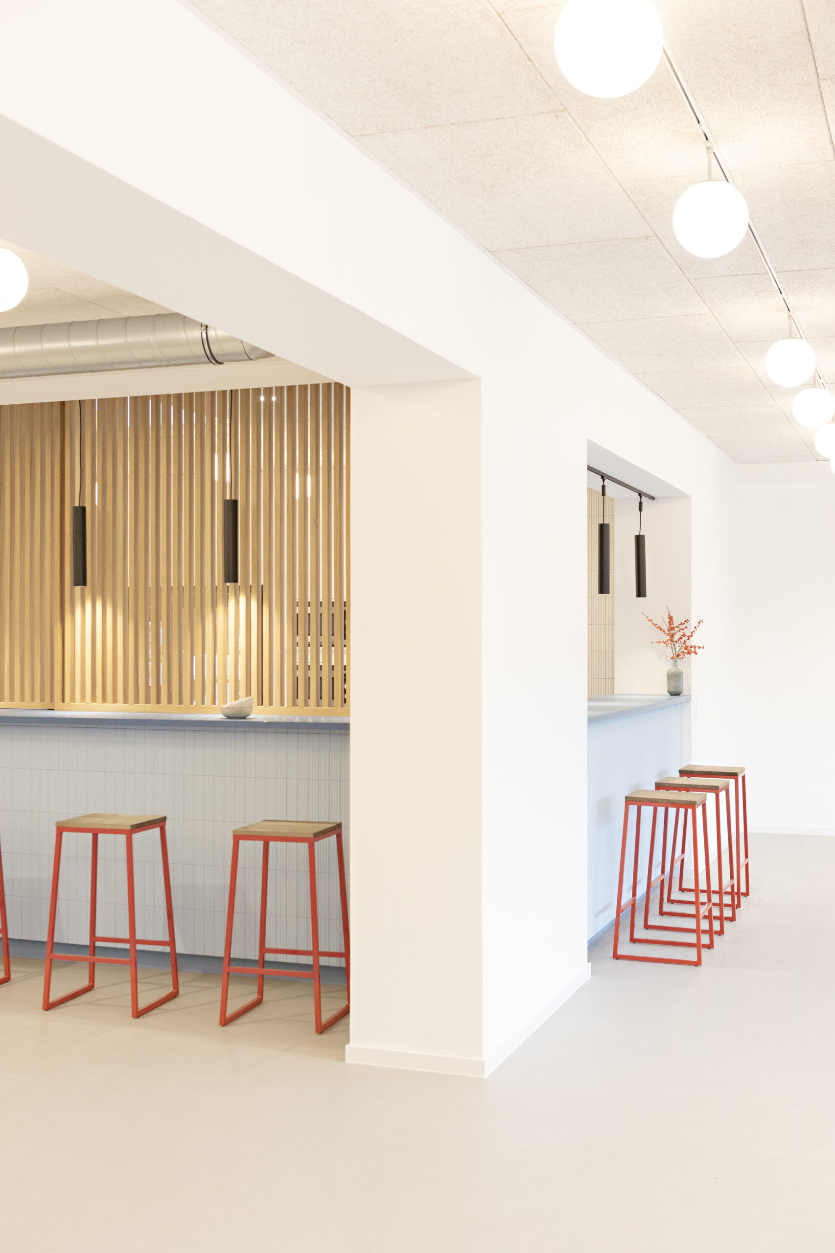 Die Einrichtung orientiert sich an den Firmenfarben die im Zusammenspiel mit hellem Holz eine gemütliche Atmosphäre schaffen.
